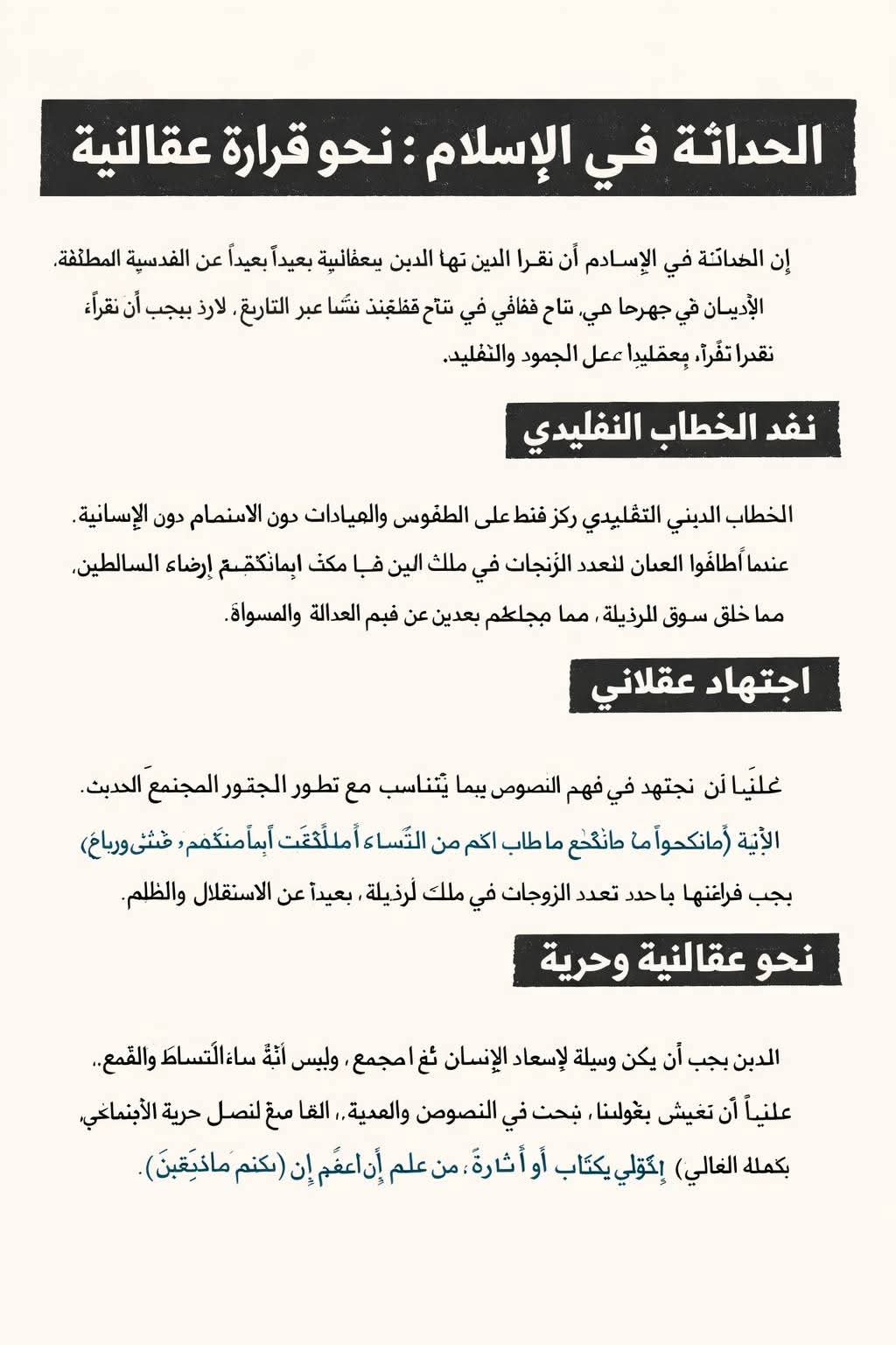 الحداثة في الإسلام ليست رفضًا للدين أو النصوص، بل إعادة قراءتها من منظور عقلاني وثقافي، وتحويل النصوص إلى أدوات للنمو الاجتماعي والأخلاقي، مع احترام الروح الدينية دون القدسية المطلقة. الاجتهاد المفتوح يتيح للإنسان أن يكون واعيًا ومتفلسفًا، ويوازن بين العقل والروح، بين حرية الفكر والتنظيم الاجتماعي، وبين التراث والتجديد، وهو السبيل لبناء مجتمع حديث، عقلاني، وأخلاقي في آن واحد.
